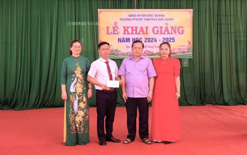 Đ/c Phùng Viết Vinh – Phó Bí thư Huyện uỷ, Chủ tịch UBND huyện và đại diện lãnh đạo ĐU, HĐND, UBND xã tặng quà và chúc mừng lễ khai giảng